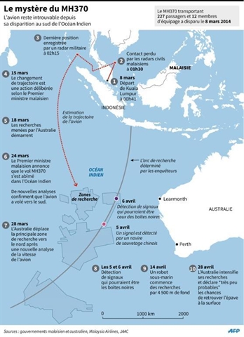Quatre navires continuent à parcourir une immense zone sous-marine dans l'océan Indien, distante au plus près de 1.600 kilomètres des côtes, et jusqu'alors uniquement cartographiée par satellite. L'Australie coordonne les recherches auxquelles participent plusieurs pays.