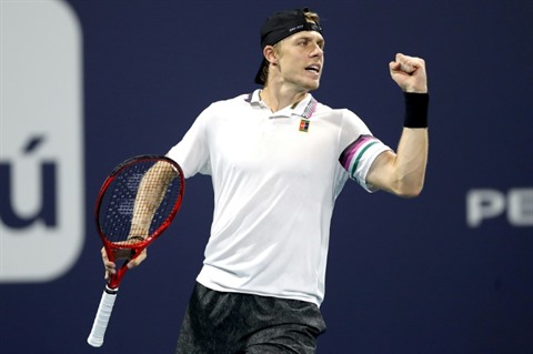 | Le Canadien Denis Shapovalov lors de sa victoire contre l'Américain Frances Tiafoe, le 24 mars |