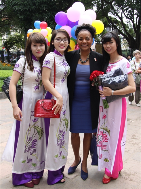 | Michaëlle Jean entourée de jeunes étudiantes vietnamiennes en ao dài (tenue traditionnelle des femmes vietnamiennes). |