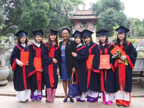 | Michaëlle Jean entourée de jeunes étudiantes vietnamiennes au Temple de la Littérature, la première université du Vietnam, le 13 novembre à Hanoi. |
