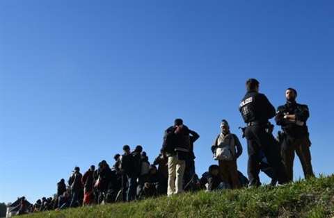 | Des migrants attendent de traverser la frontière entre l'Allemagne et l'Autriche à Simbach, le 2 novembre. |