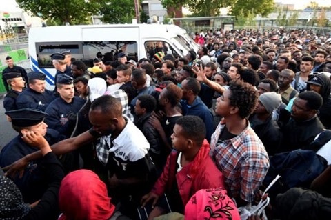 | Des CRS devant des migrants évacués d'un camp Porte de la Chapelle à Paris, le 7 juillet |