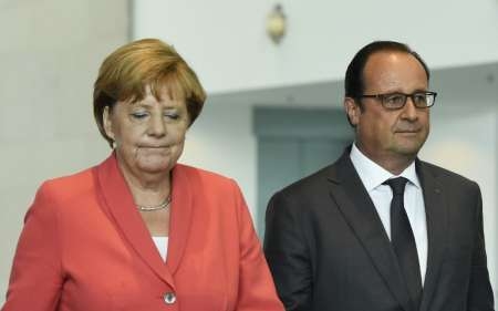 | La chancelière allemande Angela Merkel et le président français François Hollande lors d'une conférence de presse commune à la chancellerie, le 24 août à Berlin |