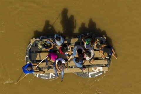 | Des migrants traversent sur un radeau de fortune la rivière Suchiate entre le Guatemala et le Mexique. |