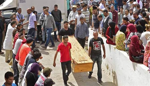 | Des Tunisiens portent un cercueil, le 4 juin à Sfax, après le naufrage d'une embarcation de migrants au large de l'archipel de Kerkennah. |
