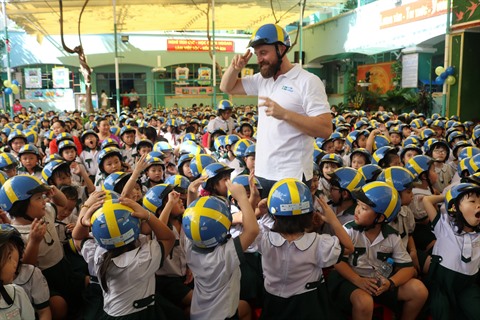 | Johan Alvin, second secrétaire de l'ambassade de Suède au Vietnam, explique aux enfants comment porter correctement un casque. |