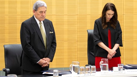 | La Première ministre néo-zélandaise, Jacinda Ardern, et le vice-Premier ministre, Winston Peters, observent, le 16 décembre au Parlement néo-zélandais à Wellington, une minute de silence à la mémoire des victimes de l'éruption volcanique du 9 décembre. |