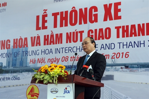 | Le vice-Premier ministre Nguyên Xuân Phuc prend la parole lors de la cérémonie de mise au trafic aux points d'intersection de Trung Hoà et de Thanh Xuân, le 8 janvier à Hanoi. |