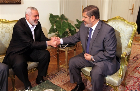 | Le Premier ministre de l'autorité du Hamas à Gaza, Ismaïl Haniyeh (gauche), et le président égyptien Mohamed Morsi, le 26 juillet au Caire. Photo : AFP/VNA/CVN |