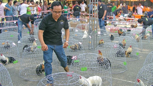 Mais venons aux critères de sélection si vous le voulez bien. Le premier stipule que nos chers candidats soient de race Gà Tre, littéralement Coq Bambou, une espèce purement vietnamienne de gallinacé d’agrément très recherchée. Il est vrai qu’avec son plumage long et velouteux, multicolore ou unicolore (noir ou blanc), sa crête rugueuse et rouge vif, son bec jaune safran et ses pattes naines, l’animal a matière à séduire. Le 2e critère, non moins important, est que tout ce beau monde doit être élevé au naturel. Et le jury n’ergote pas, ce qui peut occasionner quelques prises de bec ! De nos jours en effet, les techniques chirurgicales permettent de rendre le coq plus beau, en taillant sa crête, ou en relevant son croupion lorsqu’il est encore jeune, un «remède de bonne femme» qui allonge les rectrices tout en les recourbant. Sans parler des postiches que certains éleveurs - ne manquant il est vrai pas de toupet - tentent de poser incognito sur leur cher animal !