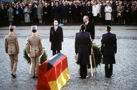 Le 22 septembre 1984, 70 ans après le début de la guerre de 14-18, MM. Mitterrand et Kohl participent à une grande cérémonie à la mémoire des victimes. Après un hommage rendu aux disparus dont les restes reposent dans l'ossuaire de Douaumont, ils se placent devant le catafalque, couvert d'un côté par un drapeau allemand et de l'autre par un drapeau français.