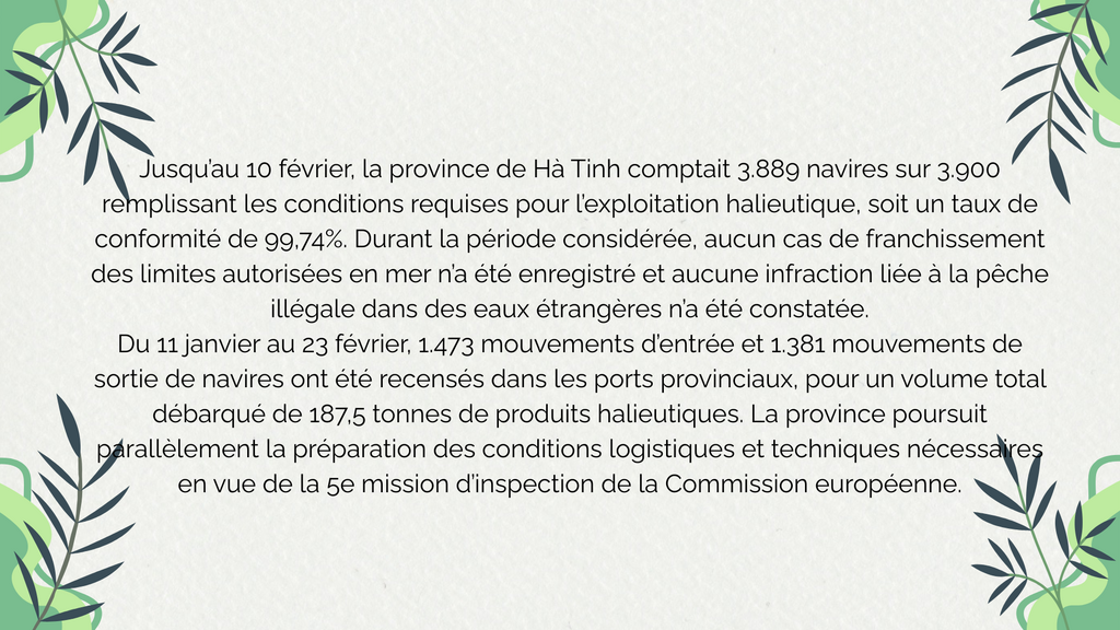Au 22 février dernier, les autorités locales avaient procédé à la vérification, au recensement et à l’intégration dans la base de données publique de 19.042 navires de pêche radiés du registre depuis 2020. Par ailleurs, 47.733 navires d’une longueur égale ou supérieure à six mètres sont désormais connectés au système électronique de traçabilité des produits halieutiques (eCDT). L’ensemble de la flotte déclarée - soit 80.324 navires - est enregistré et mis à jour dans la base nationale Vnfishbase, atteignant un taux de couverture de 100%.