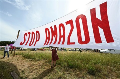 "Stop Amazon", "Ni ici ni ailleurs", ont inscrit sur deux immenses banderoles suspendues dans les arbres les opposants au projet de construction d'un entrepôt de 38.000 m2 sur la commune de Fournès à quelques kilomètres du célèbre aqueduc romain du Pont du Gard, inscrit sur la liste du Patrimoine mondial par l'Unesco.