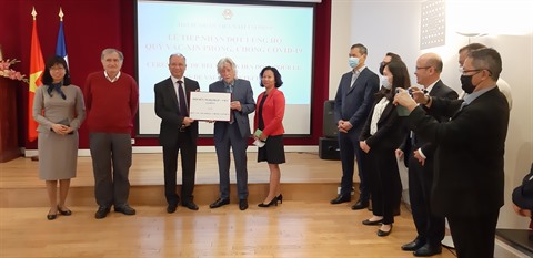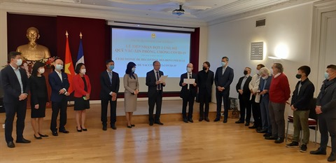 Vuong Huu Nhân, président de l'Union générale des Vietnamiens de France (UGVF) ; Gérard Daviot, président de l'Association d'amitié Franco-Vietnamienne (AAFV), des représentants de l'Union générale des étudiants vietnamiens en France (UEVF) et de la communauté vietnamienne dans certaines localités françaises ont remis ce don à l’ambassadeur du Vietnam en France, Dinh Toàn Thang.