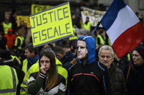 | Des "gilets jaunes" à Lyon, le 2 mars 2019, réclament une "justice fiscale". |