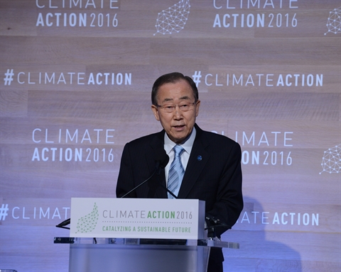 | Ban Ki-moon lors de la conférence "Climate-Action 2016", le 5 mai à Washington. |