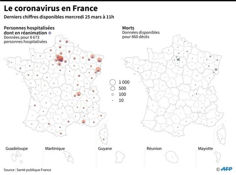 La France doit s'attendre à des "jours difficiles", a souligné le Directeur général de la Santé (DGS), le Pr Jérôme Salomon, en annonçant un total de près de 3.000 patients en réanimation (2.827, soit 311 de plus en 24 heures) : "c'est un nombre considérable, exceptionnel dans un temps aussi bref et pour une seule maladie". L'Est de la France reste particulièrement touché : un TGV médicalisé, arrivé à Strasbourg, doit évacuer jeudi 26 mars vers des hôpitaux des Pays-de-la-Loire vingt patients infectés par le coronavirus afin de soulager les hôpitaux alsaciens totalement saturés.