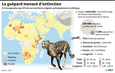 Une étude publiée cette semaine a estimé à moins de 7.100 le nombre de guépards qui subsistent aujourd'hui en liberté dans le monde, la quasi-totalité en Afrique.