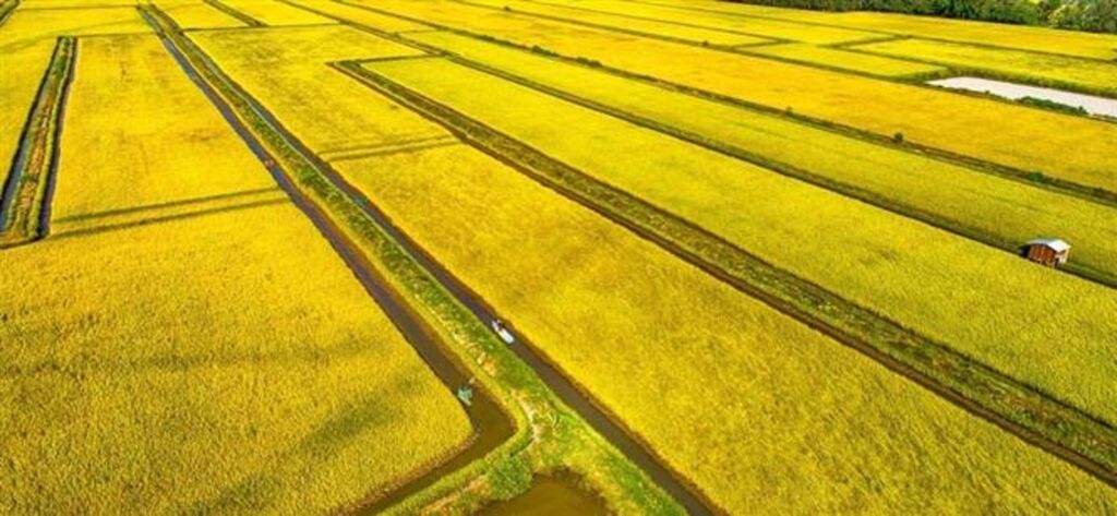 | Vue aérienne de rizières dans la commune de Vinh My, province de Cà Mau (Sud). |