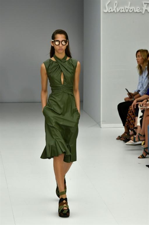 On retrouve la même recherche sur les formes et la même idée de vestiaire pragmatique façonné à partir de coupes essentielles chez Salvatore Ferragamo. Les épaules et manches sont arrondies, tandis que la silhouette est fuselée, les jupes longues et étroites s’évasant seulement à la hauteur du genou.
