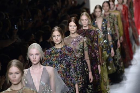 | Des mannequins présentent la collection Valentino automne-hiver 2014/15, le 4 mars à Paris. |