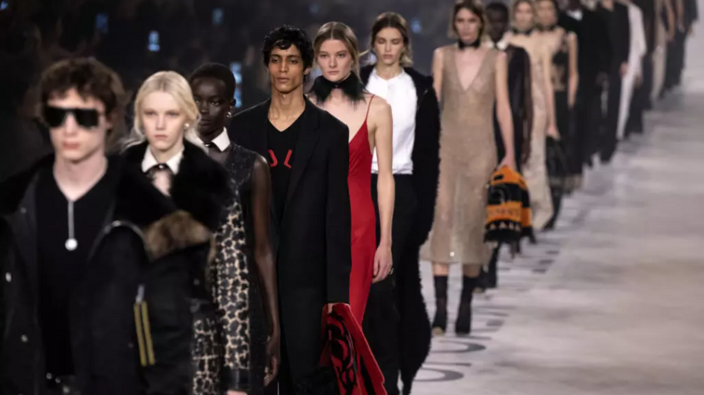 Avec des cols de chemise portés comme des colliers par les femmes, et de larges fourrures pour les hommes, Maria Grazia Chiuri a aussi revendiqué de "dépasser la distinction entre garde-robe féminine et masculine".