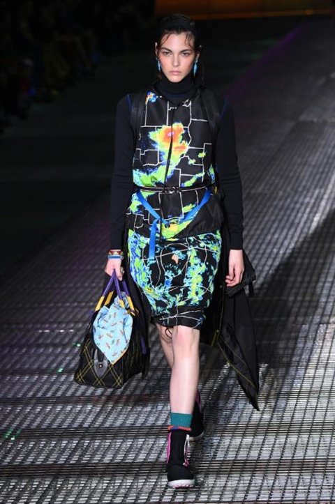 Chez Prada, hommes et femmes en imperméables fluo ou argenté sont équipés de sacs à dos, auxquels s'accrochent escarpins, chaussures de ville et gourdes de camping.