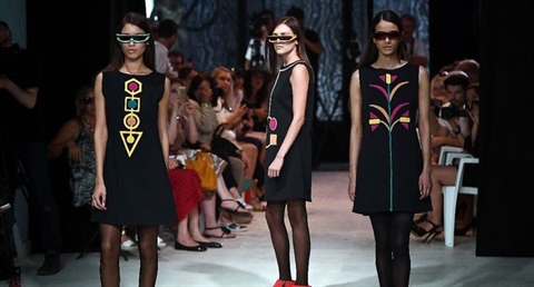 Le défilé s’est ouvert par des mannequins portant des lunettes de soleil futuristes, les hommes torse nu vêtus d’un pantalon noir ou coloré retenu par des bretelles et les femmes en jupe très courte.