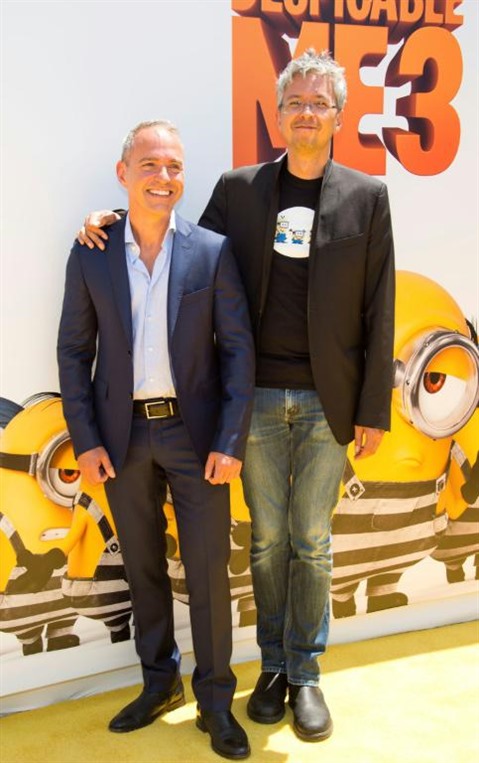 | Le metteur en scène français, Pierre Coffin (droite), et son confrère américain, Kyle Balda, le 24 juin à la première du film "Moi, moche et méchant 3" à Los Angeles. |