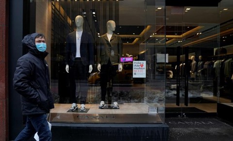 | Un homme passe devant la vitrine d'un magasin de vêtements masculins, montrant des mannequins en veste, t-shirt et baskets, sur Madison Avenue, le 15 février. |