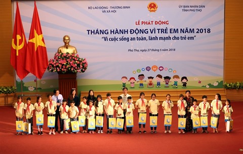 | Remise des cadeaux aux enfants défavorisés de la province de Phu Tho (Nord) lors du lancement du Mois d'action pour les enfants. |