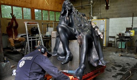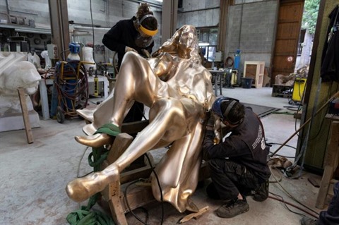 | Des ouvriers travaillent sur une statue en bronze de Molière, à la fonderie Coubertin à Saint-Rémy-les-Chevreuse, dans les Yvelines, le 15 mai. |
