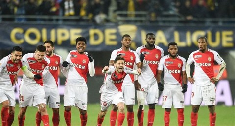 | Les joueurs de Monaco exultent après leur qualification aux tirs au but en Coupe de la Ligue face à Sochaux, le 10 janvier 2017 au stade Bonal. |