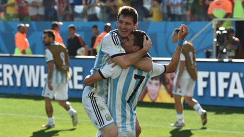 | Messi tombe dans les bras de Di Maria après l'ouverture du score de ce dernier, le 1er juillet, en 8es de finale du Mondial face à la Suisse, à Sao Paulo |