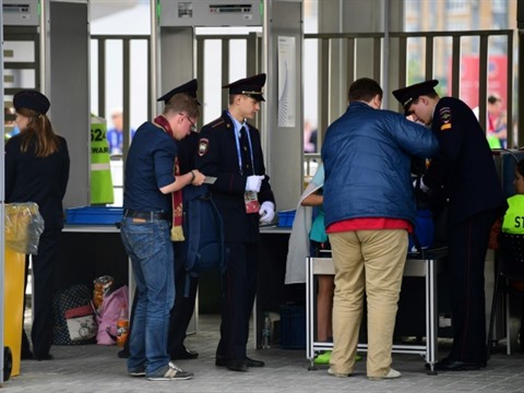 | Les forces de sécurité russes contrôlent les supporteurs arrivant à la Kazan Arena, pour la Coupe des Confédérations, le 24 juin dernier. |
