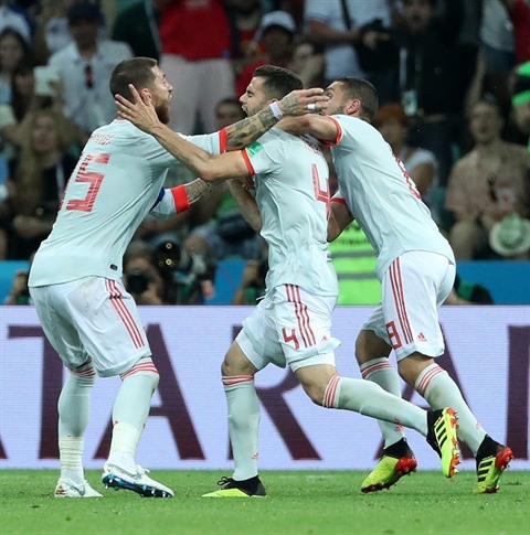 | Les Espagnols fêtent un but lort du match nul (3-3) contre le Portugal le 15 juin à Sotchi. |