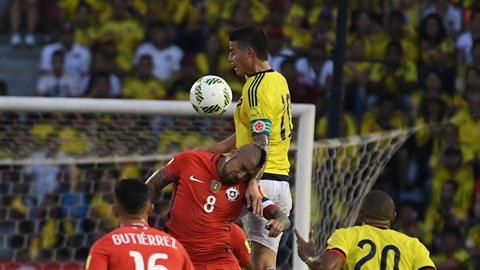 | Duel aérien entre le Chilien, Arturo Vidal (gauche), et le Colombien, James Rodriguez, en qualifications au Mondial-2018, le 10 novembre à Barranquilla. |