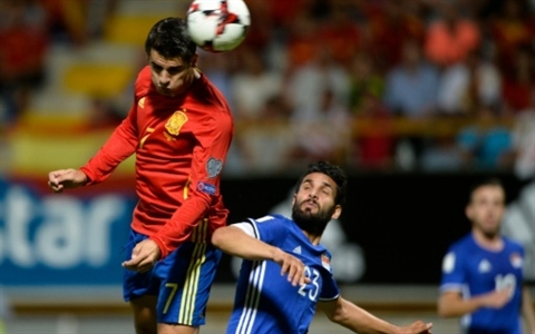 | L'attaquant Alvaro Morata (gauche) auteur d'un doublé face au Liechtenstein en qualifications pour le Mondial-2018 à León, le 5 septembre. |