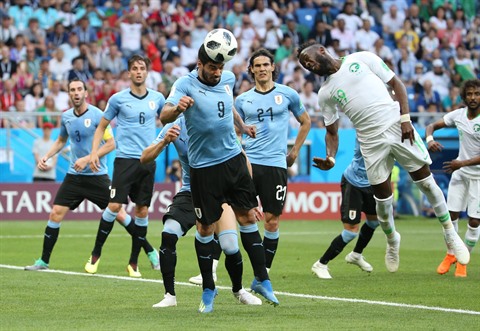 | L'attaquant de l'Uruguay, Luis Suarez (centre) lors du match contre l'Arabie saoudite à Rostov lors de la seconde journée du groupe A. |