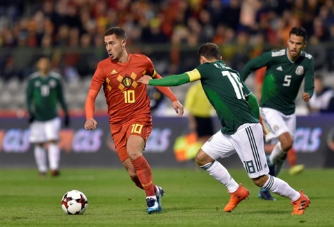 | Le milieu de l'équipe de Belgique, Eden Hazard (gauche), lors du match amical contre le Mexique, le 10 novembre 2017. |