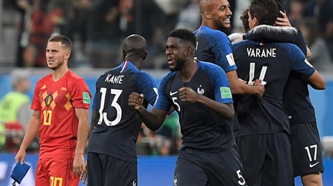 | Les Bleus fêtent leur victoire en demi-finales du Mondial face aux Diables Rouges, à Saint-Pétersbourg, le 10 juillet. |