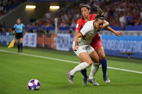 | La défenseure anglaise Lucy Bronze à la lutte avec l'attaquante américaine Christen Press lors de la demi-finale du Mondial à Lyon. |