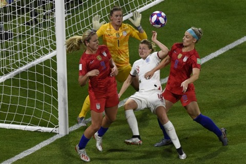 | L'attaquante anglaise Ellen White (centre) cernée par la défense américaine en demi-finale du Mondial, à Lyon |