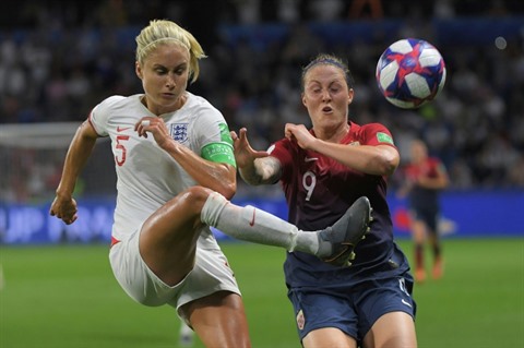 | L'Anglaise Steph Houghton (gauche) à la lutte avec la Norvégienne Isabell Herlovsen en quart de finale du Mondial féminin, le 27 juin au Havre. |
