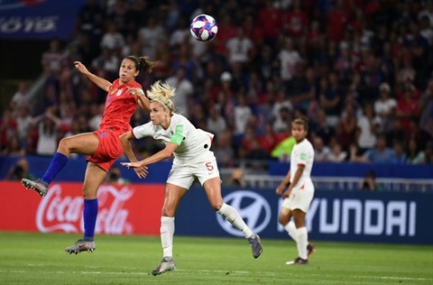 | L'Américaine Carli Lloyd au duel avec la défenseure de l'Angleterre, Steph Houghton, en demi-finale de la Coupe du monde, le 2 juillet à Lyon. |