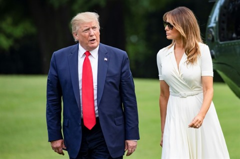 | Donald Trump et sa femme Melania descendent de l'hélicoptère Marine One, de retour à la Maison Blanche après un week-end passé dans le domaine du Bedminster Golf Resort, le 7 juillet à Washington. |