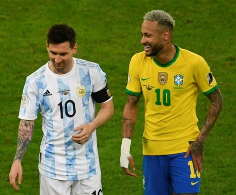 | Les attaquants argentin Lionel Messi (gauche) et brésilien Neymar, lors de la finale de la Copa America, le 10 juillet au Stade Maracana à Rio de Janeiro. |