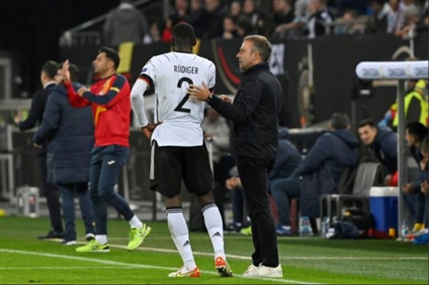 | L'entraîneur de la Mannschaft Hans-Dieter Flick donne des consignes à son défenseur Antonio Rüdiger durant le match contre la Roumanie à Hambourg, le 8 octobre. |