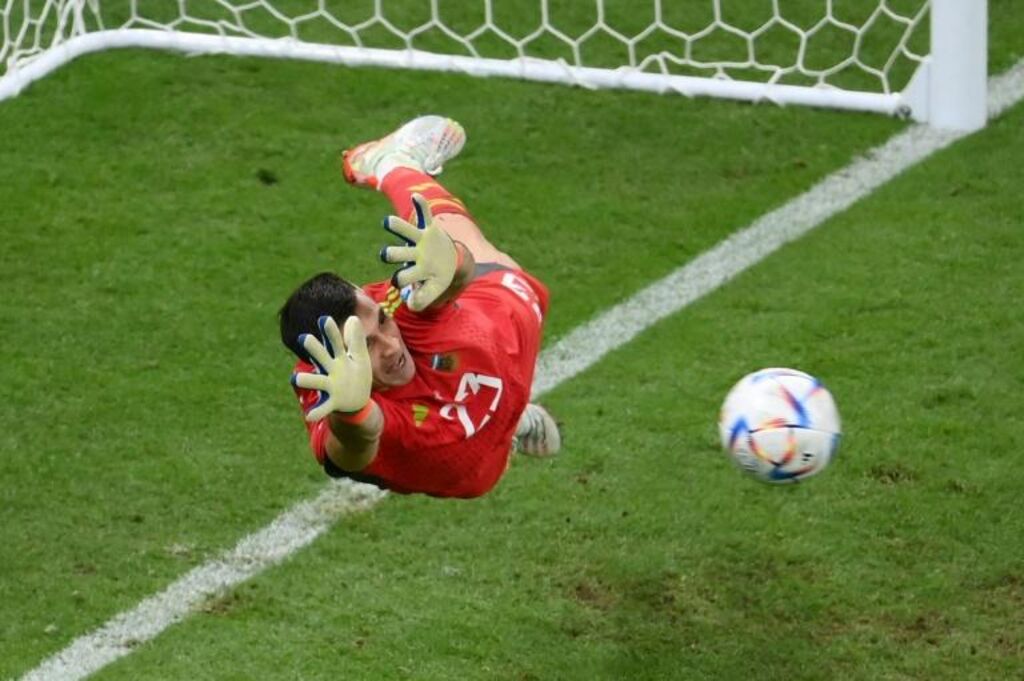 | Le gardien de l'Argentine, Emiliano Martinez, réussit un arrêt sur le tir au but de Virgil Van Djik, le 9 décembre au stade de Lusail à Doha. |