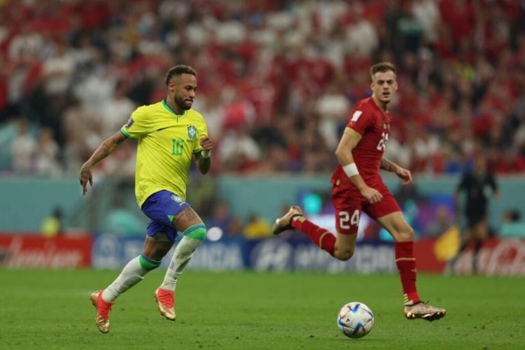 | Le Brésilien Neymar (gauche) devant le Serbe Ivan Ilic lors du Mondial, le 24 novembre 2022 à Lusail. |